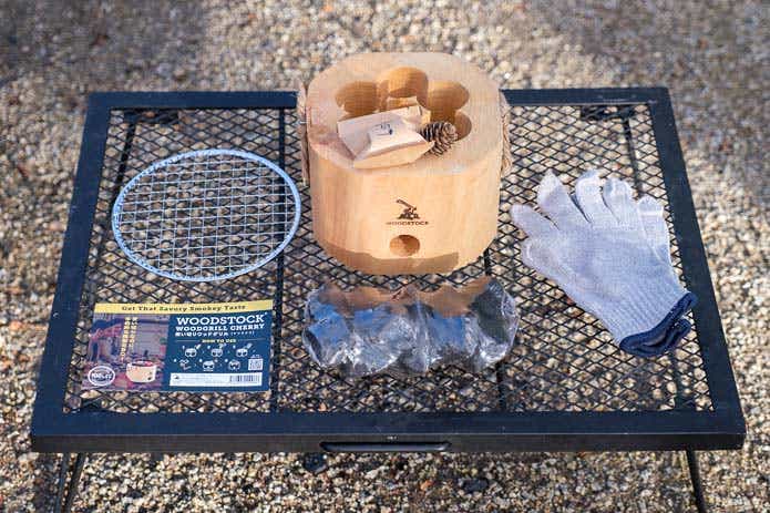 すべての内容物を広げました。焼き網はもちろん、軍手まで付属する至れり尽くせりのセットになっています。