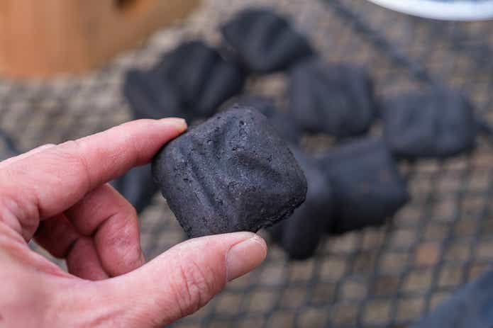 フィルムパックされた炭は、豆炭でした。丸みがあるので上部の穴にちょうどよく収まりそうですね。