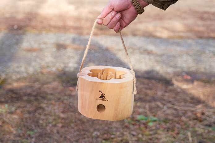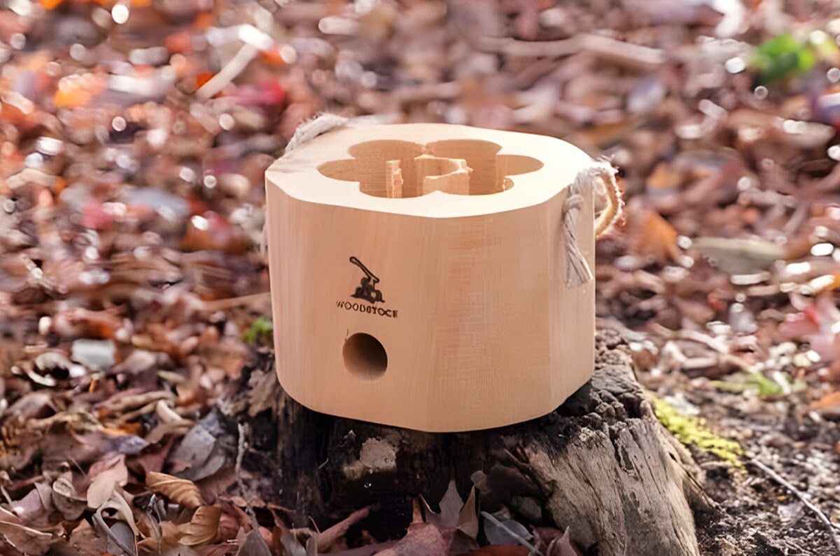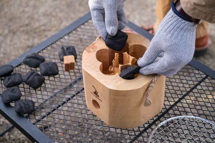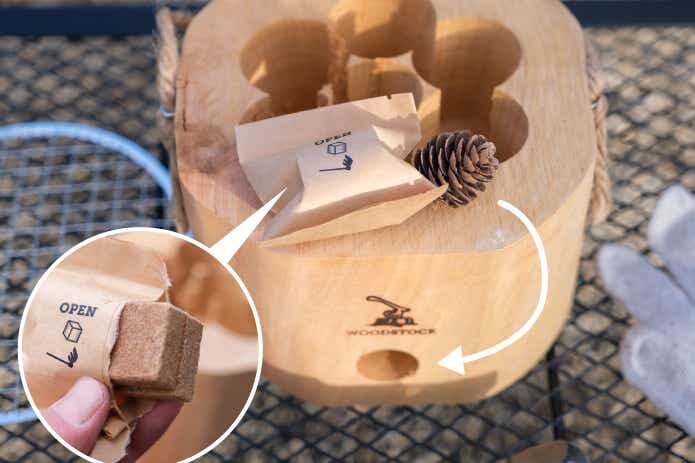 湿気対策の包装がなされた着火剤と、松ぼっくりも付属。松ぼっくりはロゴ下の横穴に入れて使います。火力が強すぎる場合、空気の流入を抑えることができるというわけですね。