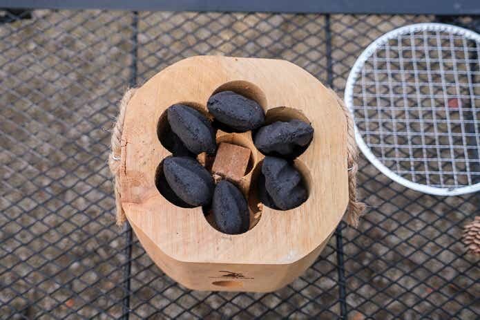 豆炭を穴にはめ込み、着火剤も入れて準備完了。あとは火を点けるだけ……なんですが、設置場所はどうしましょうか?