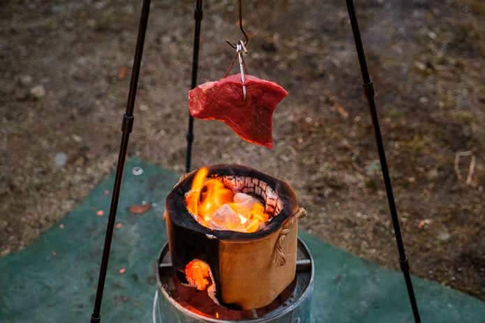 トライポッドで牛もも肉を吊るし、熱と煙でローストしてみます。網を使った場合は食材を「焼く」というより「燃やす」ことになる状態ですが、距離をとることでじっくりと炙ることができます。