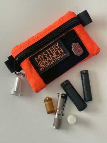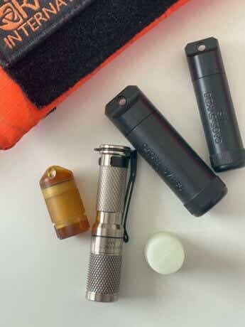 チタンの鈍く輝く質感と最大175ルーメンという小型らしからぬパワフルさに大満足。ついでに乾電池を保管できるバッテリーロッカーやポーチなども一緒に購入したので、一式を携帯用パッケージとしてキャンプなどに持ち出しています
