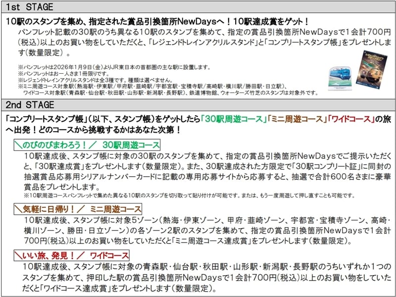 まず参加者が目指すのは、首都圏エリアを中心とした30駅の中から異なる10駅のスタンプを集めること。達成後、NewDaysなどの指定店舗で700円以上のお買い物をすると、次の特典がもらえます(数量限定)。