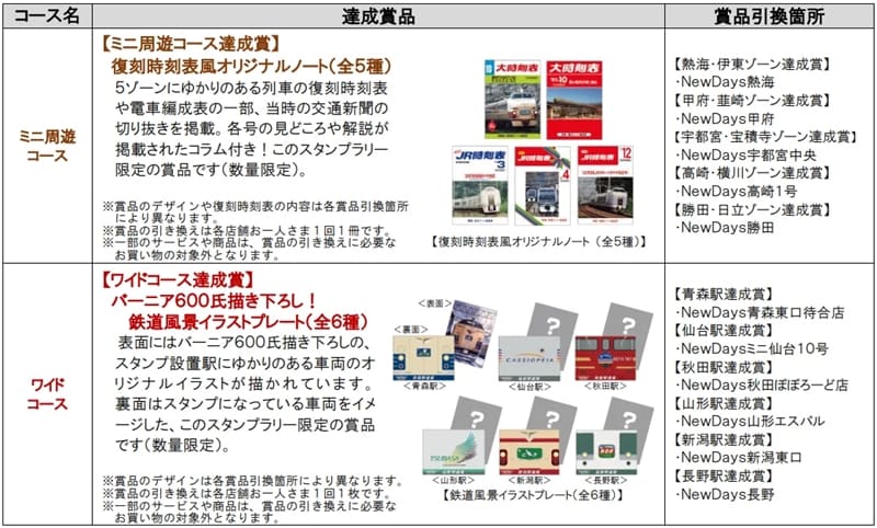 「熱海・伊東」や「高崎・横川」など指定された5つのゾーン(各2駅)で各ゾーン2駅のスタンプを集め、指定のNewDaysで700円以上のお買い物をすると、当時の時刻表や交通新聞の切り抜きを掲載した「復刻時刻表風オリジナルノート」がもらえます(全5種、数量限定)。