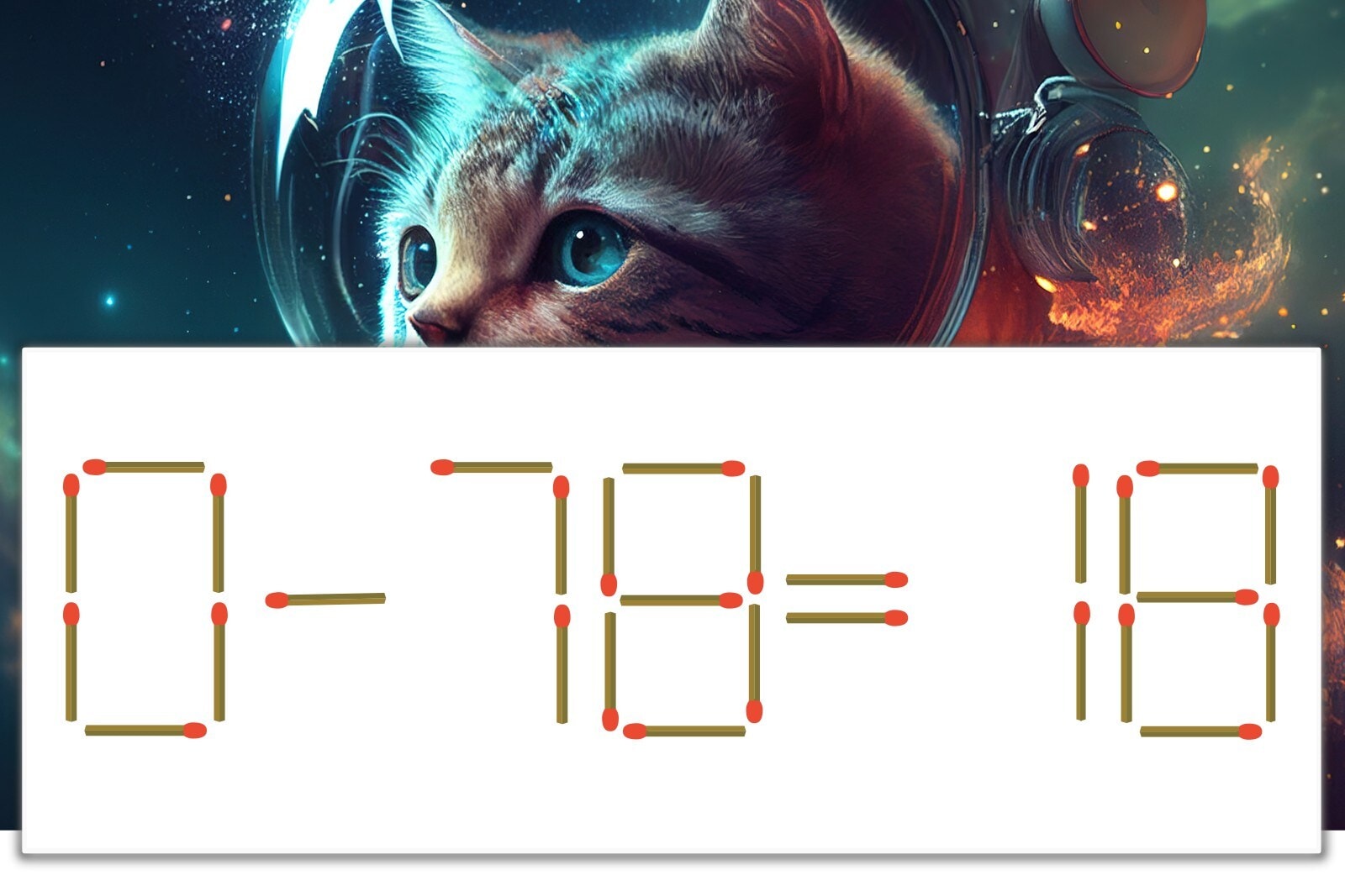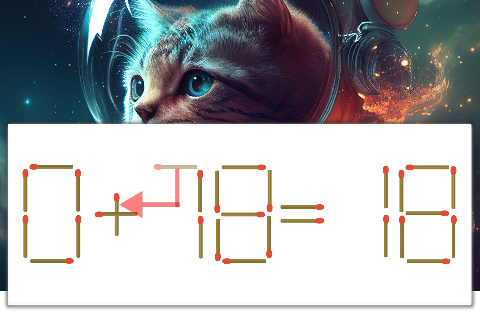「7」を別の数字に変化させると答えが導き出せます。「7」のマッチ棒を1本移動して、「-」を「+」にしてみましょう。すると、「0+18=18」が成立します。