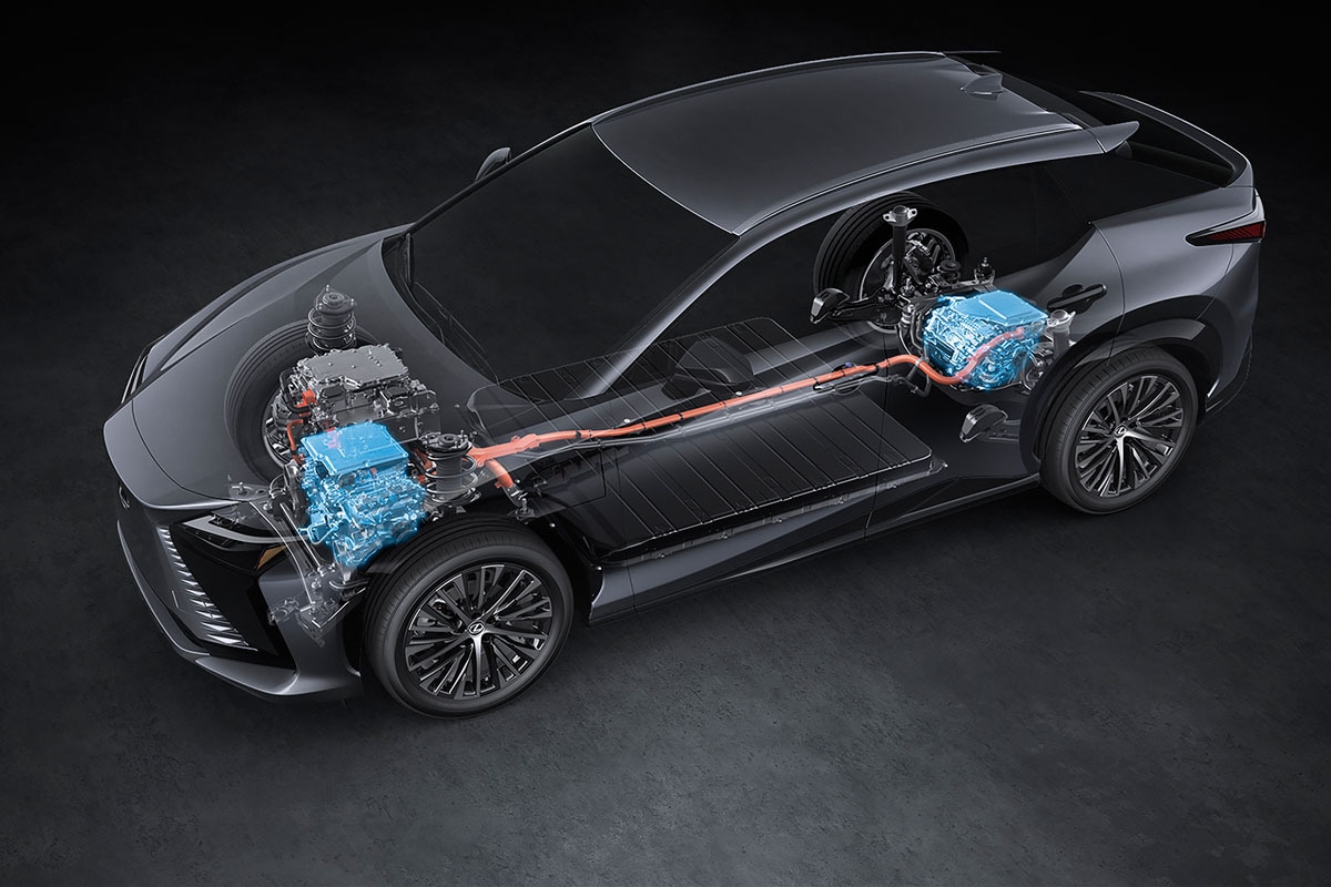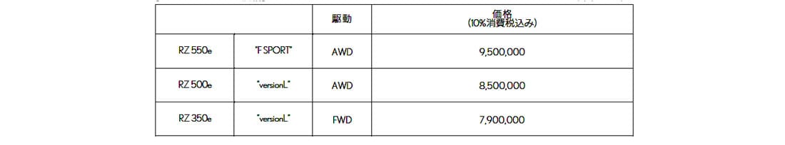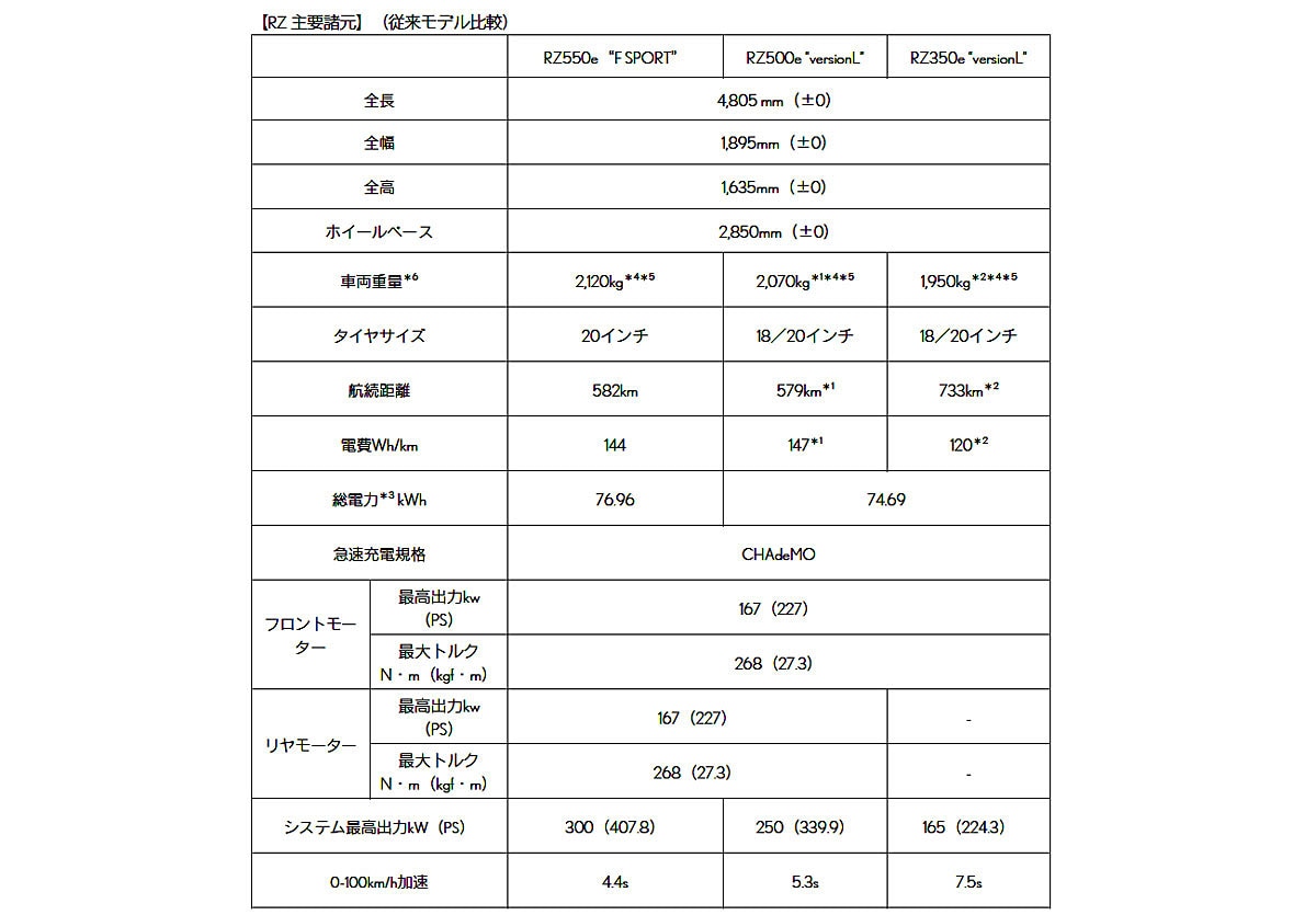 駆動用ユニットのeアクスルもインバータの効率を高めた新タイプを搭載し、最高出力167kW(227ps)、最大トルク268Nmを発生する。FWDモデル「RZ350e versionL」のほかに、同じユニットをリヤに搭載したAWDモデルはシステム最高出力が250kW(339.9ps)の「RZ500e versionL」と300kW(407.8ps)の「RZ550e F SPORT」を新たにラインナップしている。