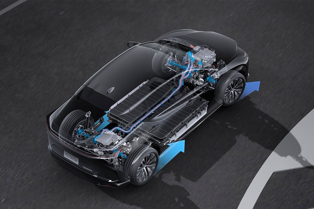 改良されたeアクスルによる電力損失の大幅な低減とバッテリーの大容量化に加えて、制御の最適化により航続距離も拡大。WLTCモードでRZ350eは733km、RZ500eは579km、RZ550eは582kmの一充電走行距離を実現している。