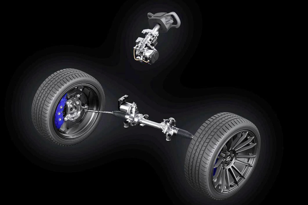 オプション設定のレクサス初となるステアバイワイヤ・システムは中立位置から左右約200度の範囲で操舵が可能で、専用の航空機操縦舵形のステアリングホイールを採用している。このジェイテクト製のバイヤーステアはRZ550e F SPORTに設定されている。