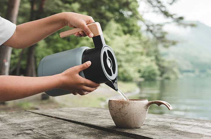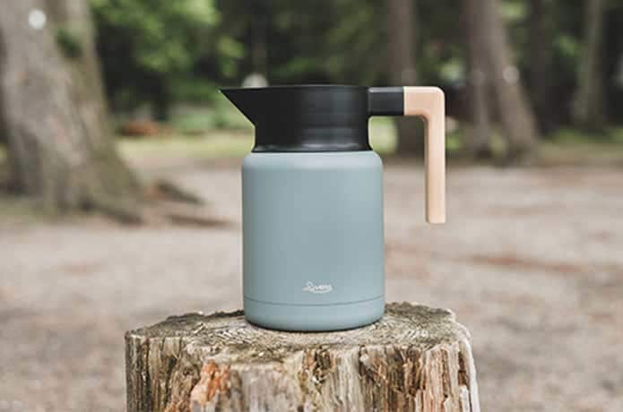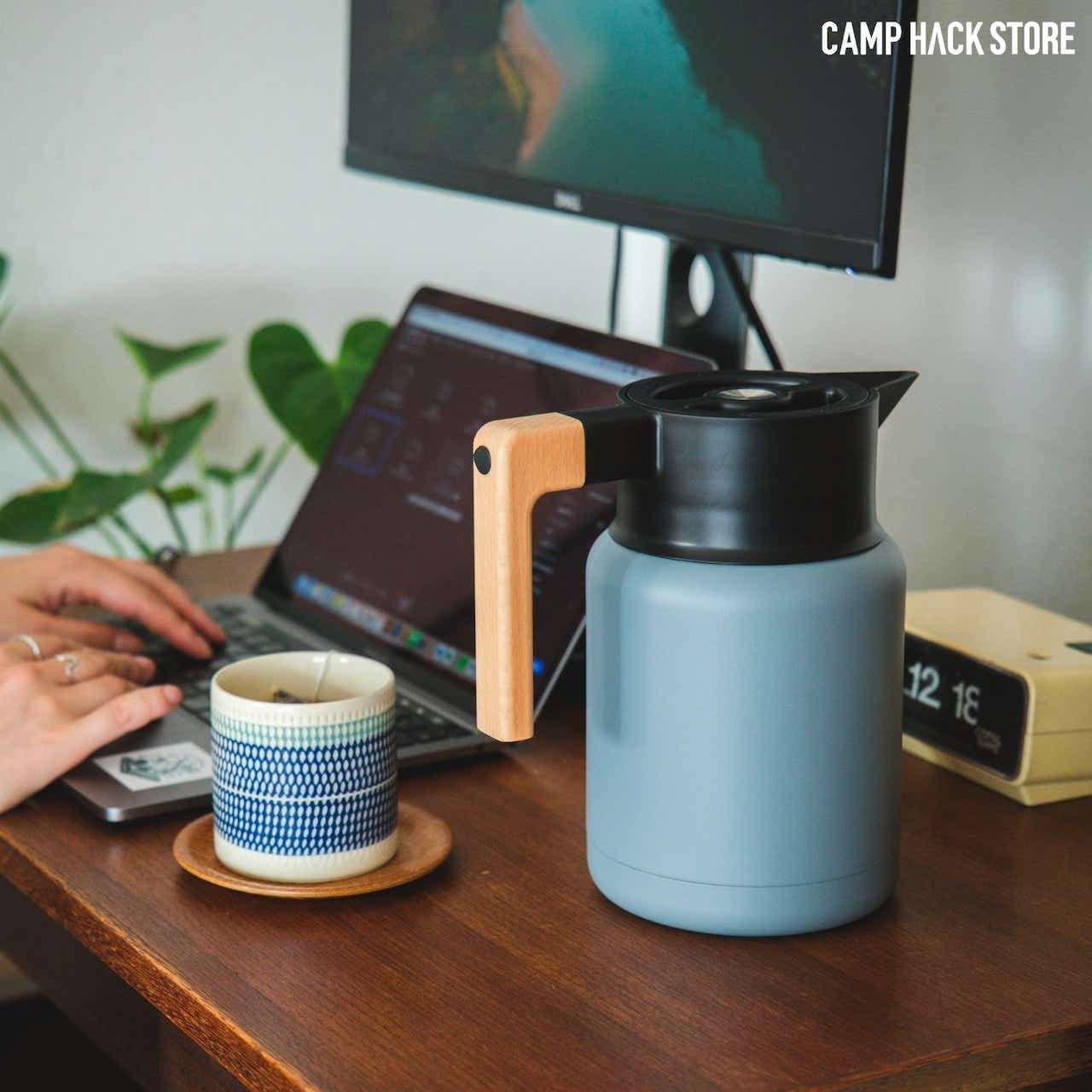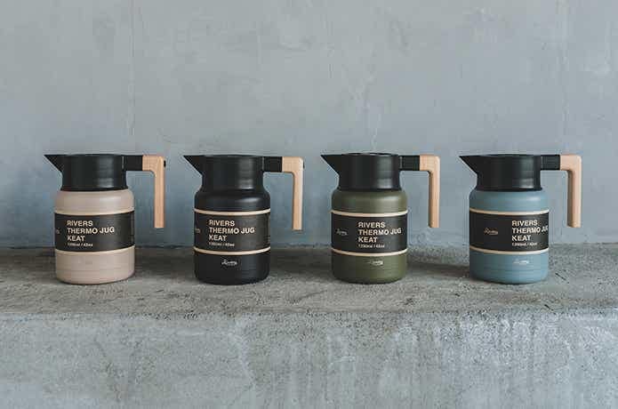 Riversの「サーモジャグキート1200」は、くすみカラーとウッドハンドルの組み合わせが秀逸。サイトのテーブルに置いても、家のダイニングになじませても“雰囲気を壊さない”佇まいが魅力です。