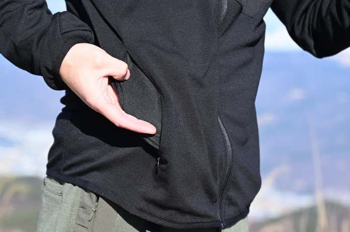 左右のウエストポケットは内側が起毛素材になっており、手を入れるとハンドウォーマーとして使えます。メッシュやナイロンではなく起毛を採用している点は、寒い時期の使用を考えると好印象でした!