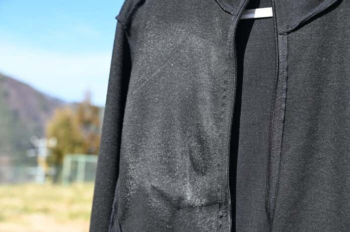 そして、速乾性の高さも特筆すべきポイントです。気温8℃ほどの晴天時、ウェアを裏返してしっかりと水を吹きかけ、乾燥スピードをチェックしてみました。正直なところ、乾くまでに30分以上はかかるだろうと予想していたのですが……。