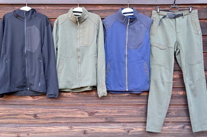 左から、「メリノテック アクティブインサレーション フーディ」、同シリーズのジャケット、ベスト、パンツ
