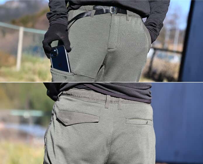 フロントとバックの左右ポケットに加え、右太もも部分にもポケットを備え、収納力も十分です。