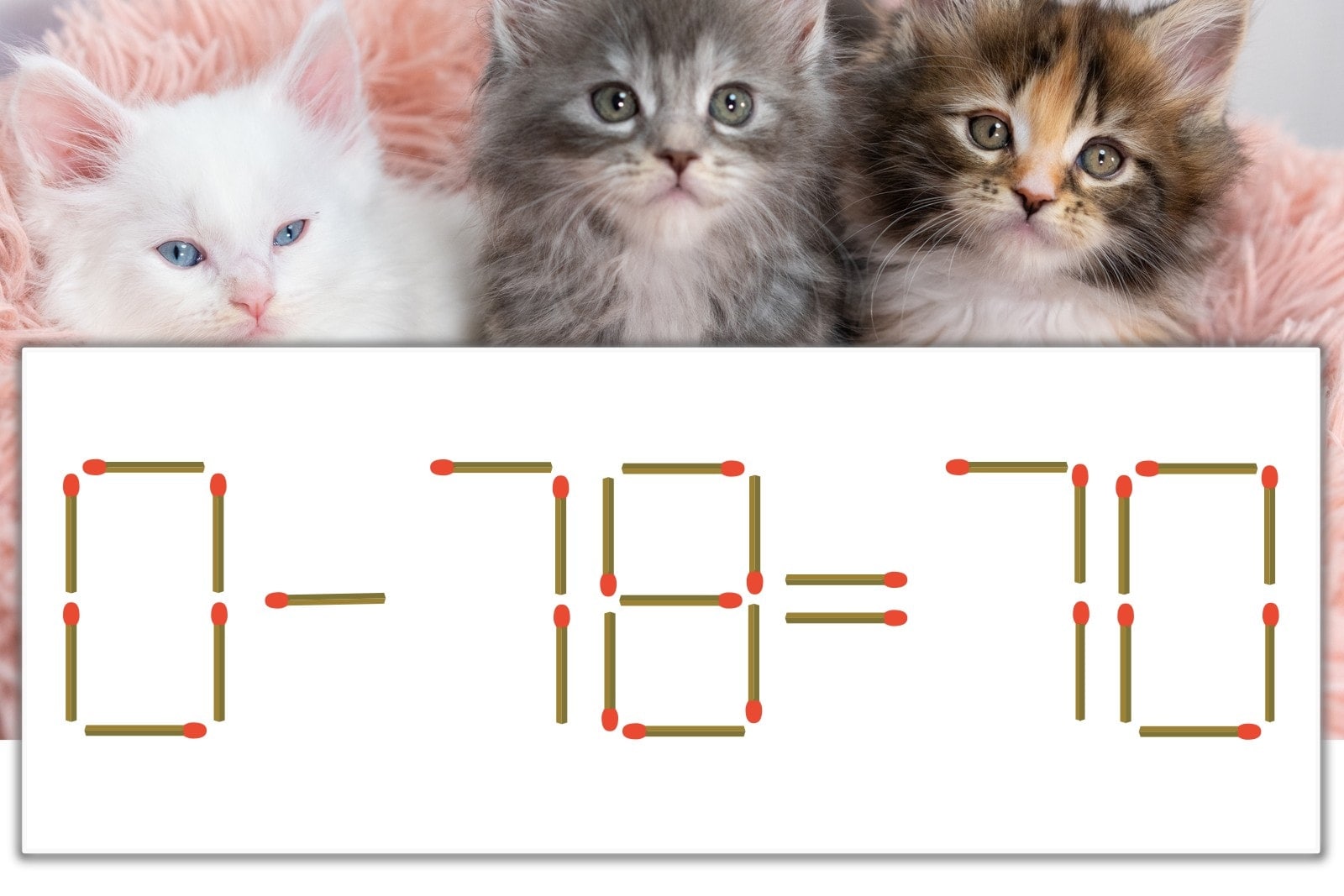 「8」を別の数字に変化させると答えが導き出せます。「8」のマッチ棒を1本移動して、「-」を「+」にしてみましょう。すると、「0+70=70」が成立します。
