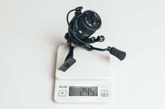 最初に持ったときに、「あれ? リールってこんなに重かったっけ?」と体感で感じるほど。測ってみるとこの通り。