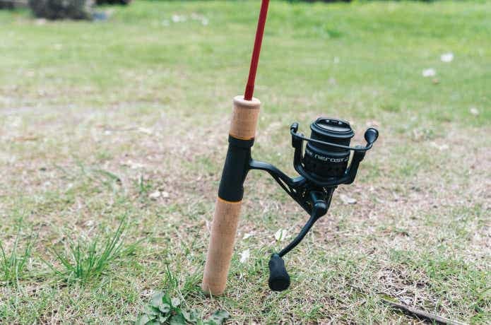 安価なリールには安価なロッドを合わせるのが一番。日頃から愛用している鱒レンジャーと組み合わせます。