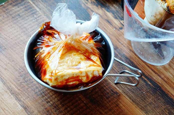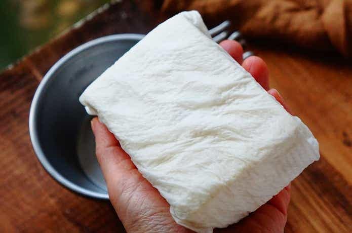 まず豆腐の水切りです。パッケージには電子レンジ調理が推奨されていますが、キャンプだと無理ですよね。