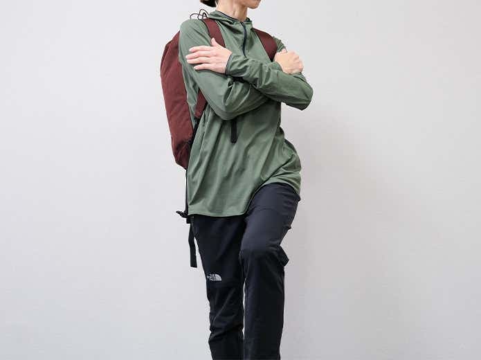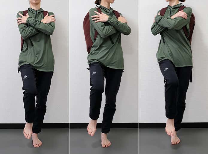 バランス感覚(平衡性)の強化におすすめなのは「リュックを背負って片脚バランス」。ふらつかずに踏ん張る力を高め、荷物を背負った状態での重心コントロールを鍛えるトレーニングです。