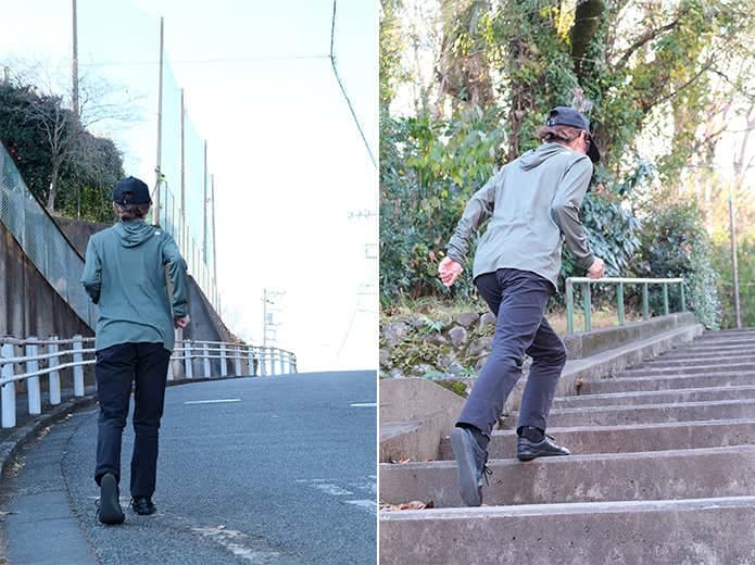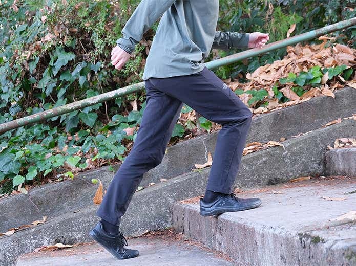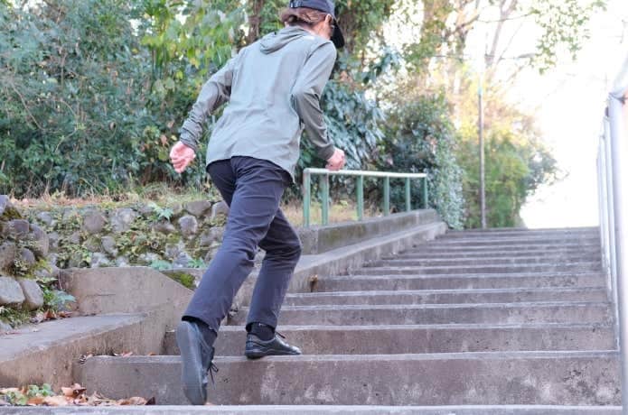 心肺機能+脚の筋持久力をまとめて鍛えられるのがメリット。登山に近い動きができる、近所の坂道や階段で行います。なければ平地でも構いません。
