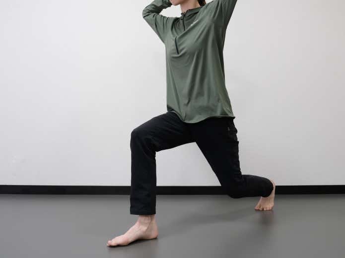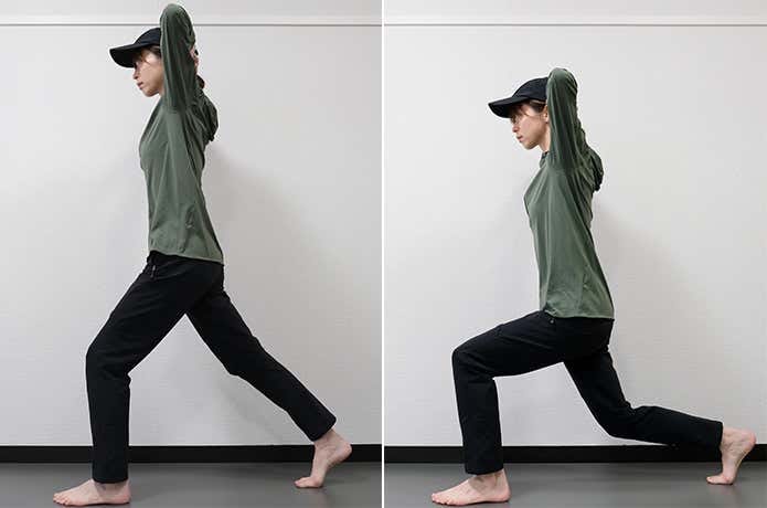 筋力の強化におすすめなのは「スプリットスクワット」。下山時にブレーキ役として最も酷使される、太ももの前側(大腿四頭筋)を鍛えるトレーニングです。