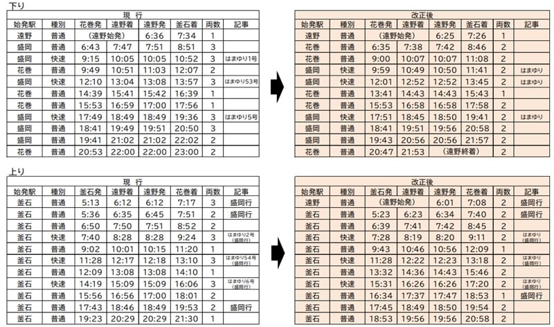 現在は「キハ100系」「キハ110系」気動車で運行していますが、2026年1月19日から一部列車を、ディーゼルハイブリッドシステムを搭載した新型気動車「HB-E220系」に置き換えて営業運転を開始します。2026年1月19日の「釜石 9:02発 花巻行き(658D)」が新型車両の営業運転初列車になり、3月14日のダイヤ改正日以降は、すべての列車が「HB-E220系」になります。