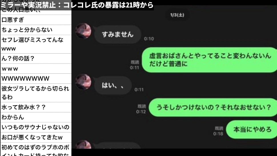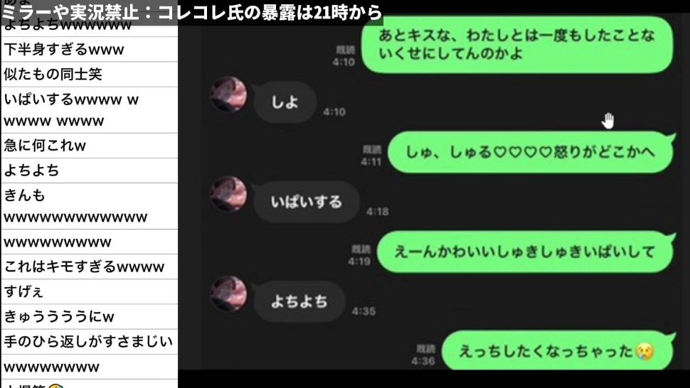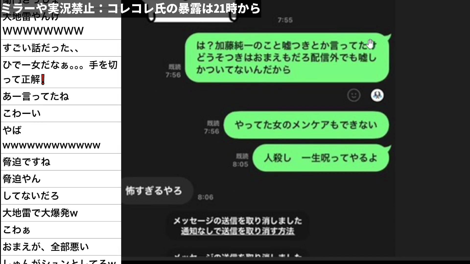 その中では、配信での暴露や「命ネタ(※自死に関わる言動をすること)」に言及。昨年不倫騒動で炎上した加藤純一の名前を出し、「もう一生会えないならいいよ 加藤純一よりひどいよおまえ」「加藤純一のこと嘘つきとか言ってたけどうそつきはおまえもだろ配信外でも嘘しかついてないんだから」とコレコレを罵倒しています。さらに「やってた女のメンケアもできない」「人殺し 一生呪ってやるよ」と送信し、これにコレコレは「怖すぎるやろ」と返信していました。