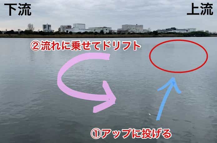 基本は流れに対してアップクロスで投げて、ゆっくりただ巻きしてドリフトさせるのみです。