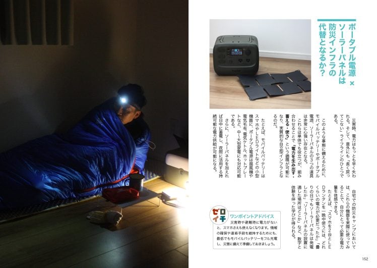 さらに後半では、自宅で行う防災キャンプ、野外で行う災害想定のソロキャンプを筆者自ら実践し、技術・知識・経験・準備のポイントを具体的に紹介している。Amazon Kindleで発売。192ページ、税込み500円。