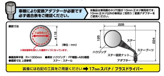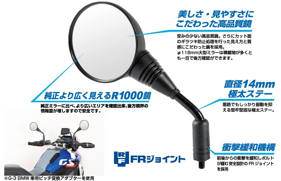同製品は、φ118mmの大径ミラーとワイドビュー設計により、純正比で広い後方視界を実現し、安全性の向上を図っている。また、直径14mmの極太ステーを採用することで走行中の振動を抑制し、未舗装路でも安定した視認性を確保する点も特徴である。価格は4,950円(税込)。