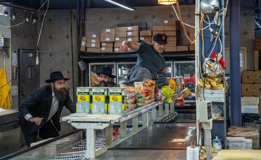 イースト・ブロードウェイを駆けるハンクの後ろに見えてくるのは、世界貿易センターのツインタワーだ。「ニューヨーカーとしても、映画人としても興奮したね。当時は街のどこにいてもツインタワーが見えたんだ。ツインタワーを見れば、自分の居場所がわかった」と監督が回想する。さらに営業中のスーパーマーケットでもチェイスが展開。「通路を前のめりに走る(ヴィンセント・)ドノフリオを広角レンズで歪ませて撮っている」と監督が説明し、「海藻をぶちまけた」とオースティンが笑う。