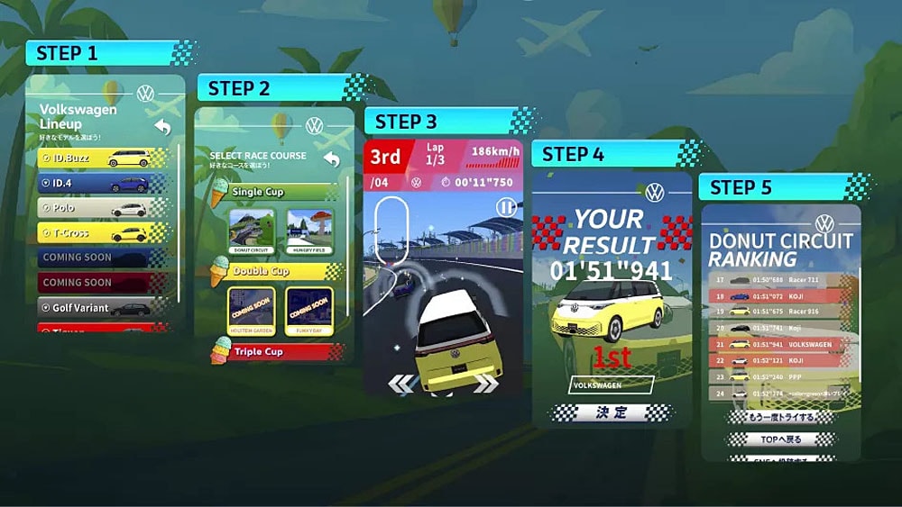 ゲーム「Volkswagen DRIVE CARnival」は、フォルクスワーゲンの多彩な車種ラインアップが楽しめるレーシングゲームで、コンパクトな「ポロ」、「T-Cross」からSUV、ステーションワゴン、EVミニバン「ID.Buzz」まで幅広いラインアップをゲームを通じて、ライフスタイルに最適な車種を見つけてもらうために開発されたという。
