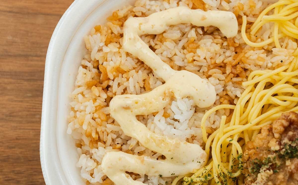 ご飯の上には、背脂にんにくマヨネーズがたっぷりとトッピングされており、ペペロンチーノの上にはごろっとしたサイズ感の唐揚げが2個。