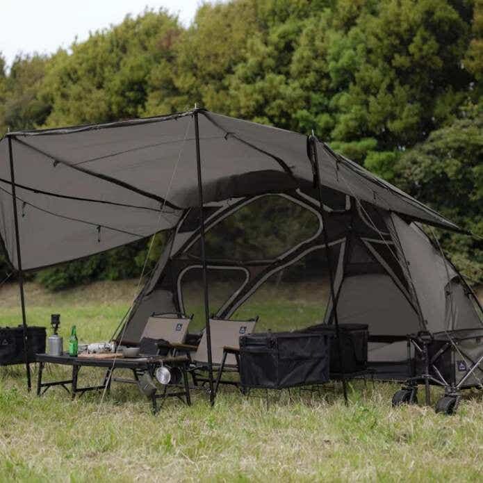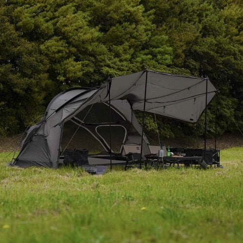 ドームテントの居住性の高さと、タープの開放感や広々としたリビングスペースを両立させたユニークな構造が特徴的。フロントパネルは大きく跳ね上げ可能で、アレンジは12パターン以上! 夏はフルメッシュで通気性抜群、冬は煙突ポートとスカート装備で暖か……とオールシーズン大活躍です。