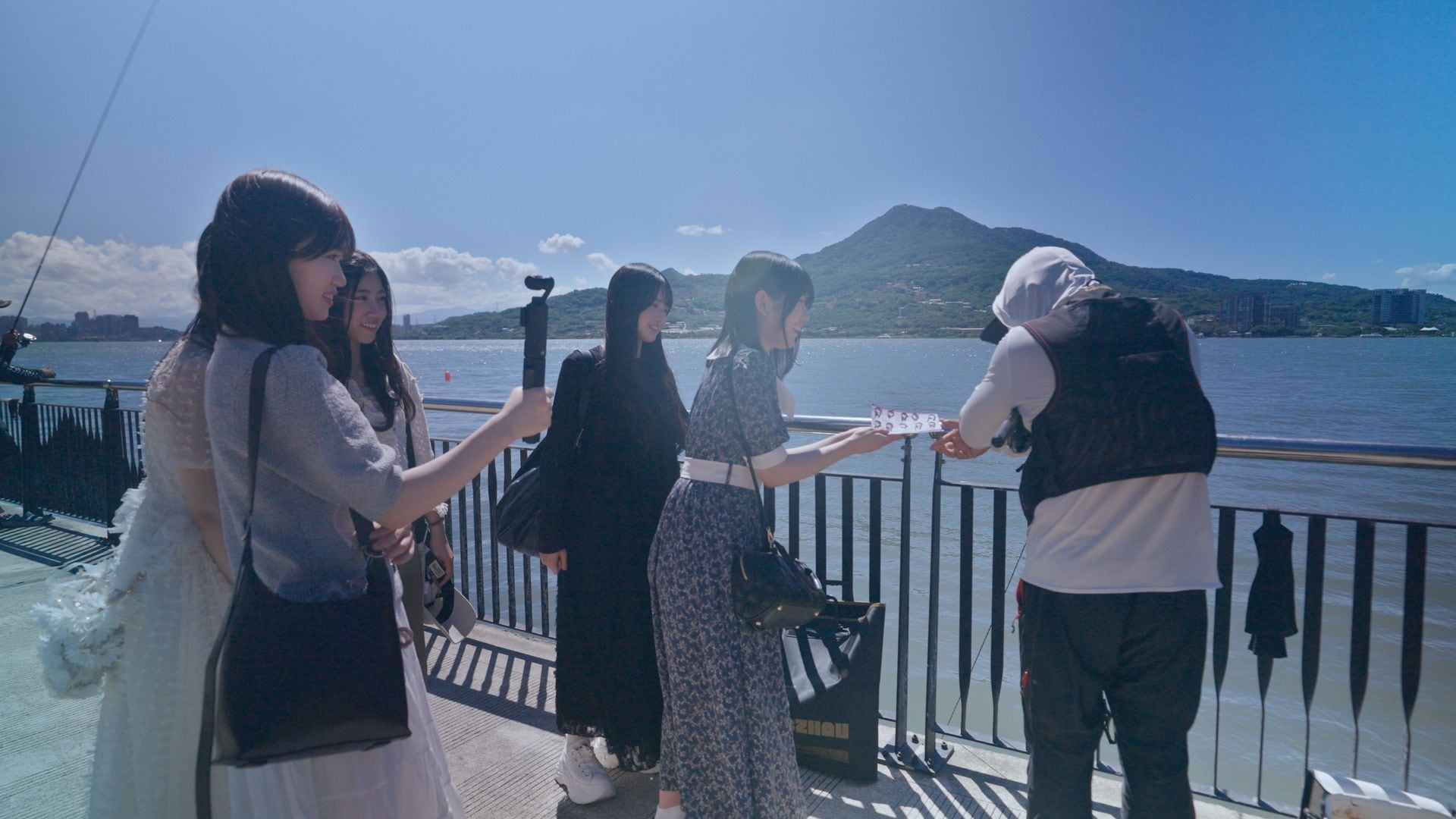 今回は、北チームの旅をお届けする。訪れたのは水辺の景色が魅力の港町・淡水。淡水公園に到着し、釣りをしている人が気になるメンバー。増田三莉⾳が「何を釣ってるんですか?」と声をかける。さっそく翌日のライブのチラシを渡してPR!