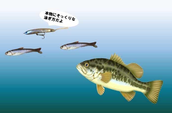 ですが、本物のベイトでバタバタしたりブルブルしたりして泳ぐ小魚は殆どいません。