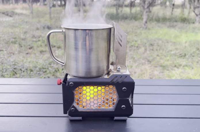 燃焼中は天板(6.5cm×7cm)がしっかり熱くなり、お湯を沸かしたり、飲み物や小さなクッカーを温めたりといった使い方が想定されています。