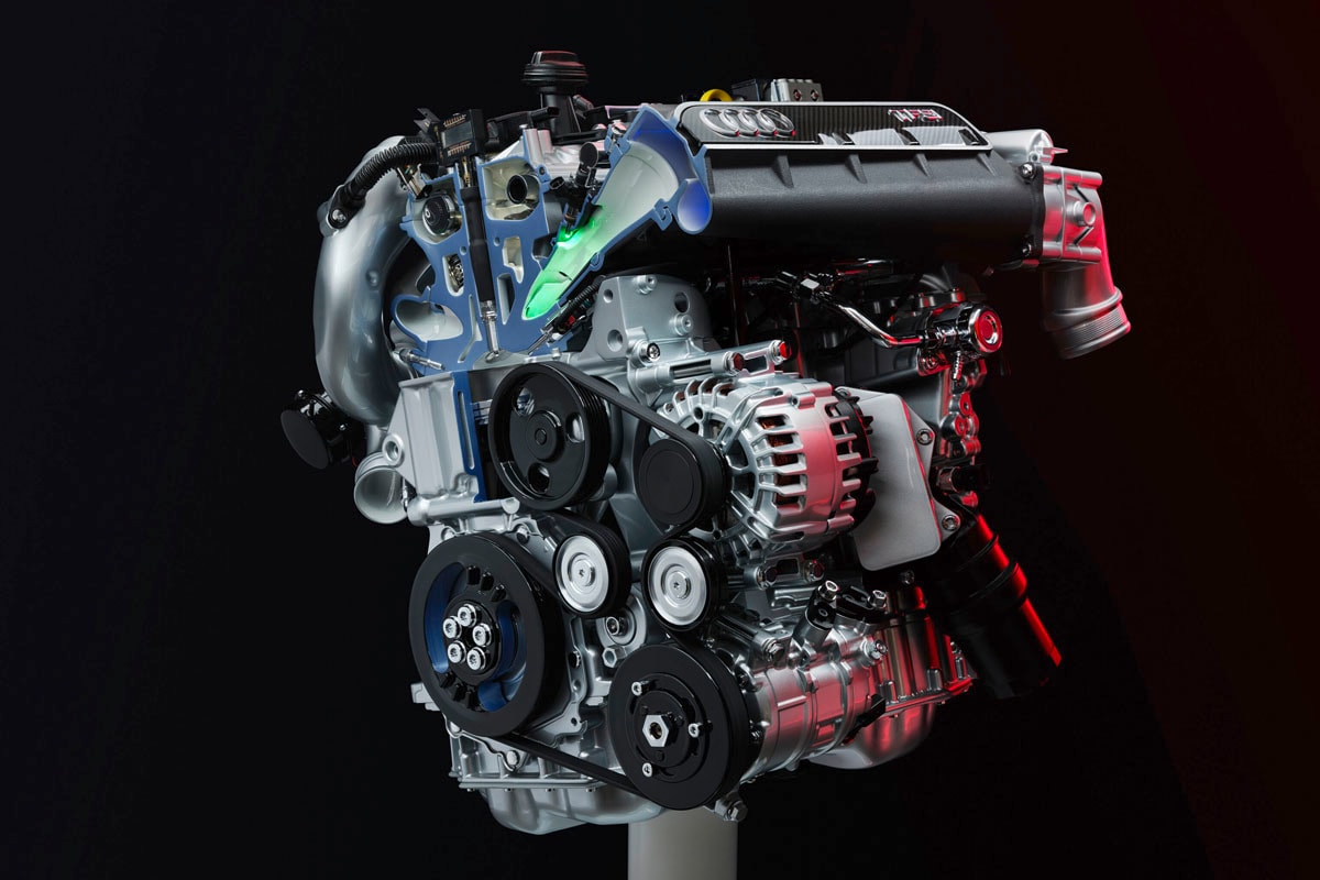 TFSIという略語はターボと直噴ガソリンを意味している。2.5 TFSIは、インテークマニホールドと燃焼室に噴射するデュアルインジェクションに加え、排気バルブを可変制御するバルブリフトシステムを採用している。これにより、混合気をより精密に調整でき、燃料消費を抑えつつ最適なパワーを実現している。5気筒エンジンでは、燃料は250バールで噴射され、大型ターボチャージャーは、最大過給圧1.5バール(相対値)/2.5 バール(絶対値)という高過給圧を発生する。