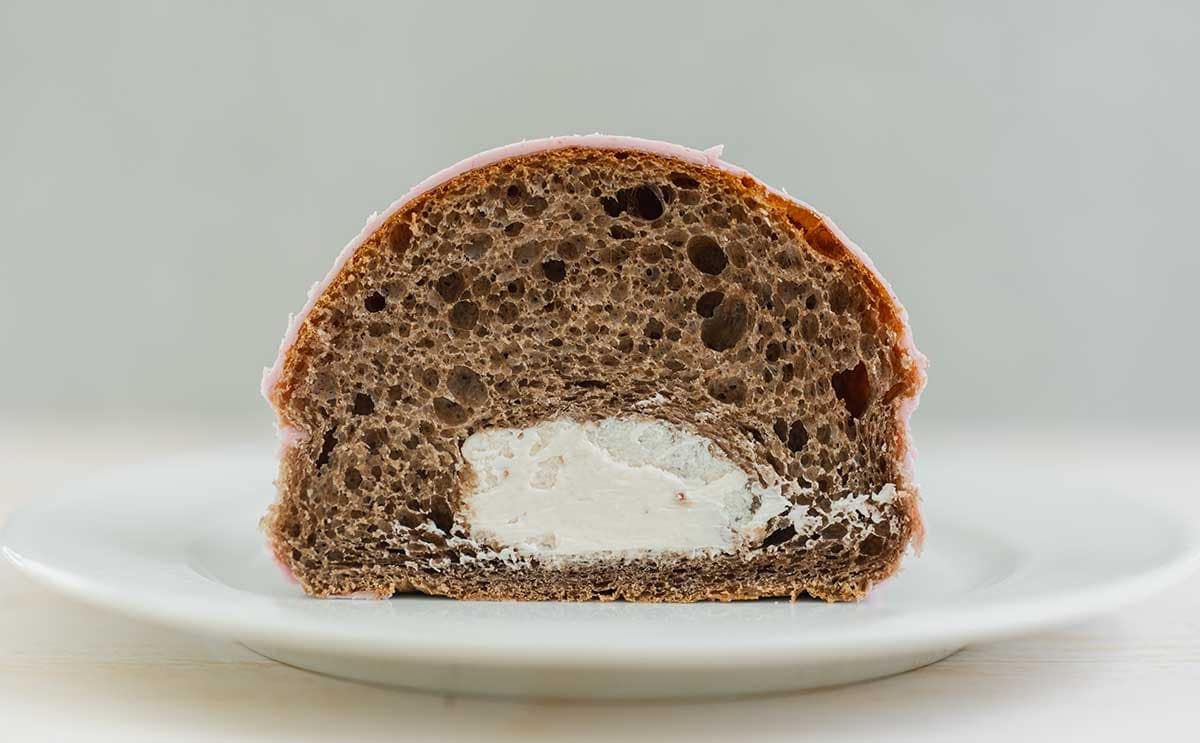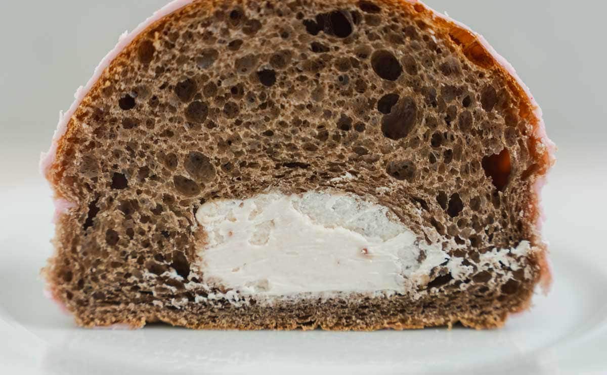 次は断面チェック。ココアを練り込んだパン生地はショコラ色に。真ん中にいちごホイップが入っています。
