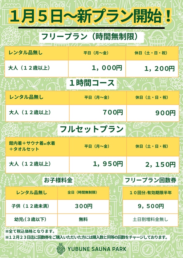 舞桜は、「YUBUNE SAUNA PARK -はにゅうの湯-」において新しいプランを提供開始しました。この新プランは「フリープラン」「1時間コース」「フルセットプラン」の3つがあり、それぞれのプランにより利用者のライフスタイルに合わせた利用が可能となっています。「フリープラン」では時間無制限でサウナを満喫でき、平日は1,000円、休日は1,200円で利用できます。1月のイベント盛りだくさん