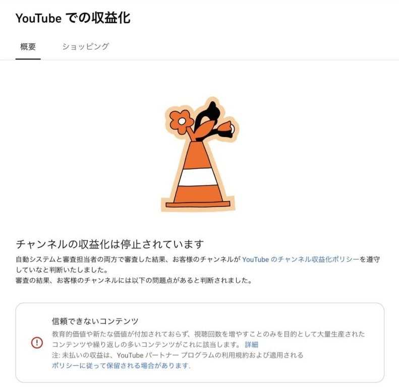 収益化停止されてしまいました・・・本日いろんな方も報告されてますが、大規模なBAN祭りが始まっているようです。この1本のメールで月30万飛びました。… pic.twitter.com/Ymk3uFVk0n