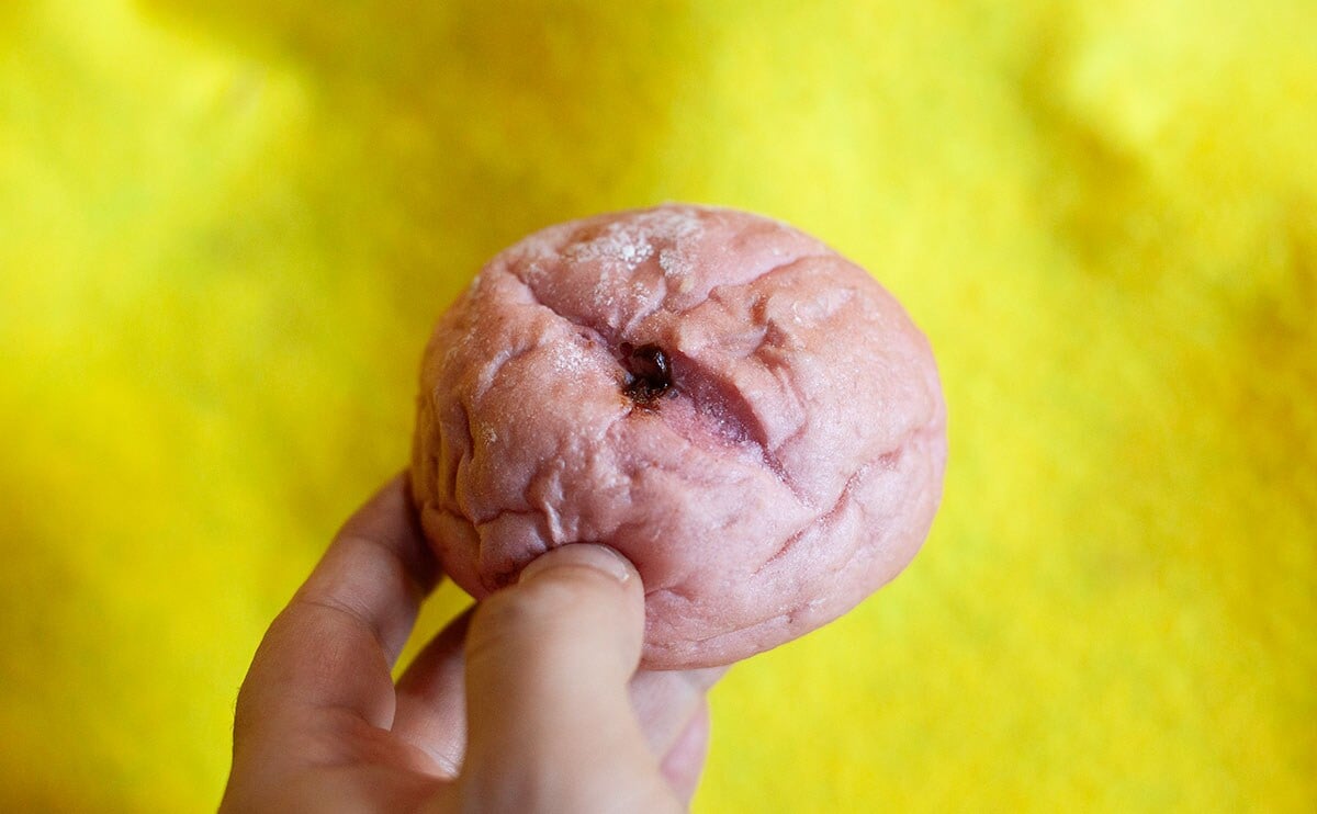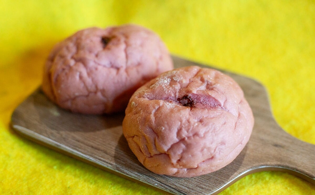 生地がほんのりピンクに色づいて、見た目からもいちごらしさを感じますね。表面のしわ(?)のせいでゴツゴツしているようにも見えますが、触ってみるとやわらかいです。