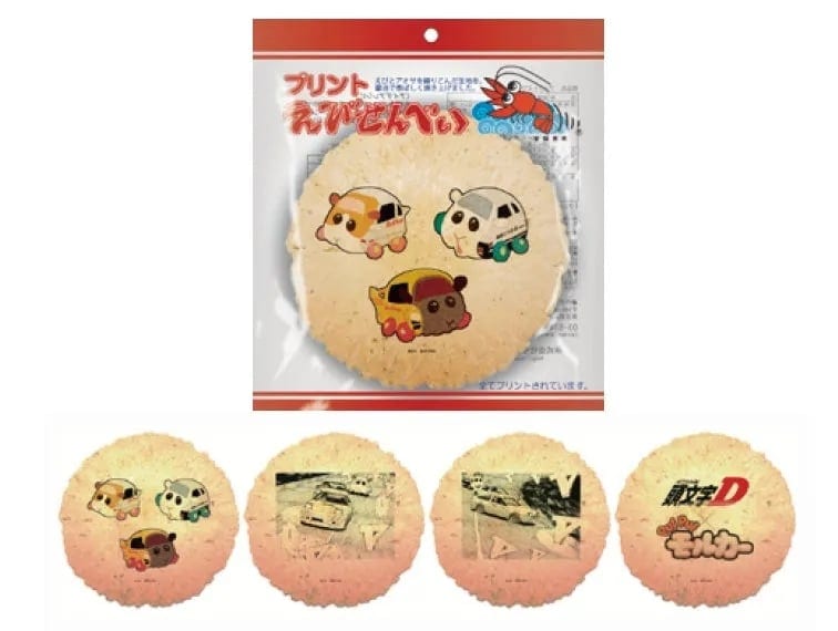 軽やかな食感のえびせんべいにも、モルカーと頭文字Dのコラボデザインが施されており、手軽なプレゼントにも適している。