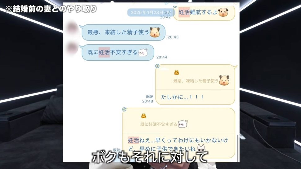 不摂生な生活を送ってきたはじめしゃちょーは、自身が子どもを持てるか不安だったらしく、妻とは「2025年中に結婚して、子どもも産みたいね」と話していたのだとか。証拠として、2025年1月23日に妻と妊活についてLINEでやり取りしているスクリーンショットも提示しました。