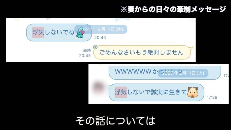 2024年12月11日のやり取りでは、「浮気しないでね」という妻に、はじめしゃちょーは「ごめんなさいもう絶対しません」と返信しており、浮気をしていたことをうかがわせます。