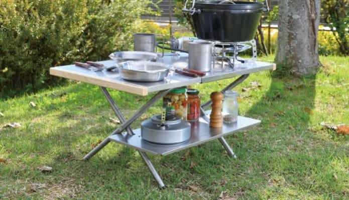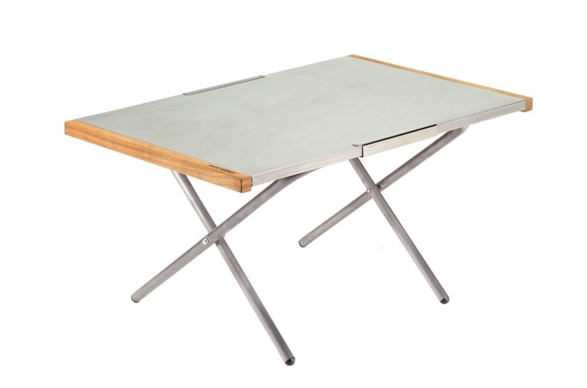 約70cm×45cmの天板には、耐久性に優れたステンレス鋼を採用。焚き火から下ろしたばかりの鍋やダッチオーブンも気兼ねなく置けつつ、ラージならではの広さで調理器具や食材をまとめて置けるのが魅力です。