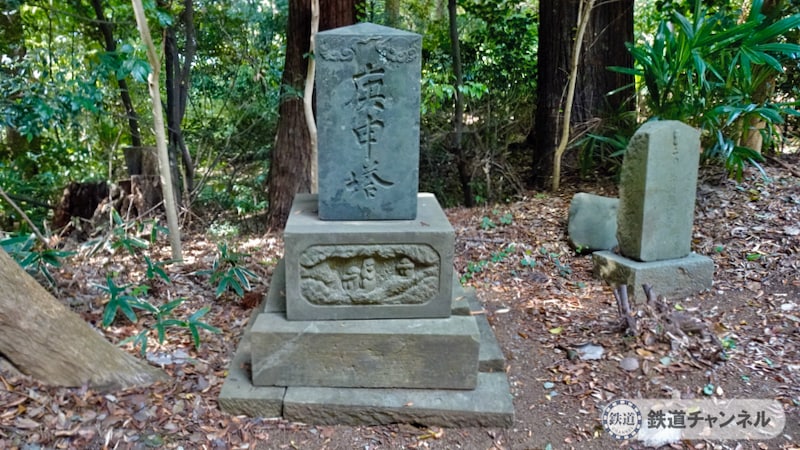 社殿の周囲に、石仏が散在しています。上部に「月」「ウーン」「日」、「庚申」と刻まれた庚申塔。右側面に「天保四癸巳年」とあるので1833年です。直射日光で見難く写っています。