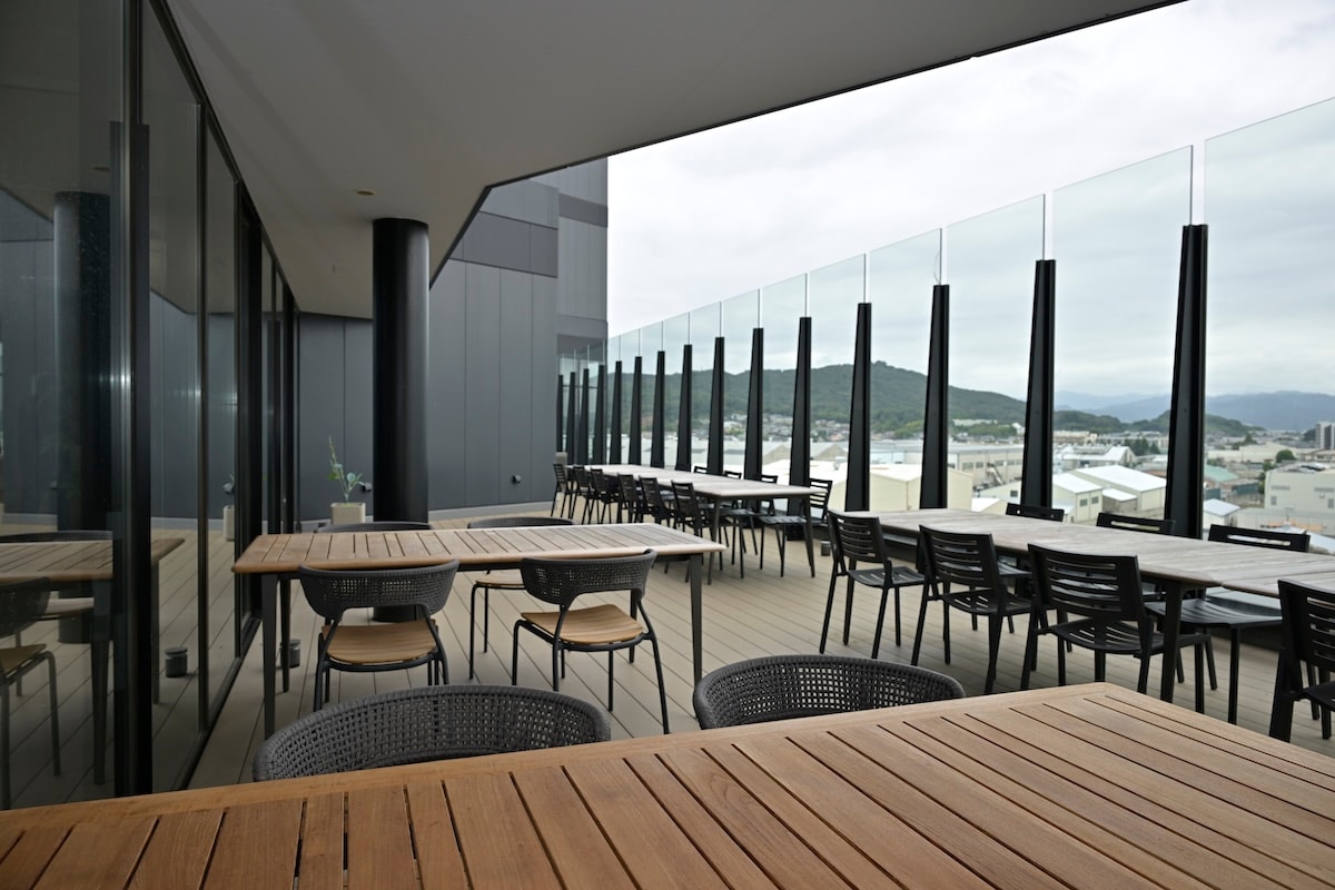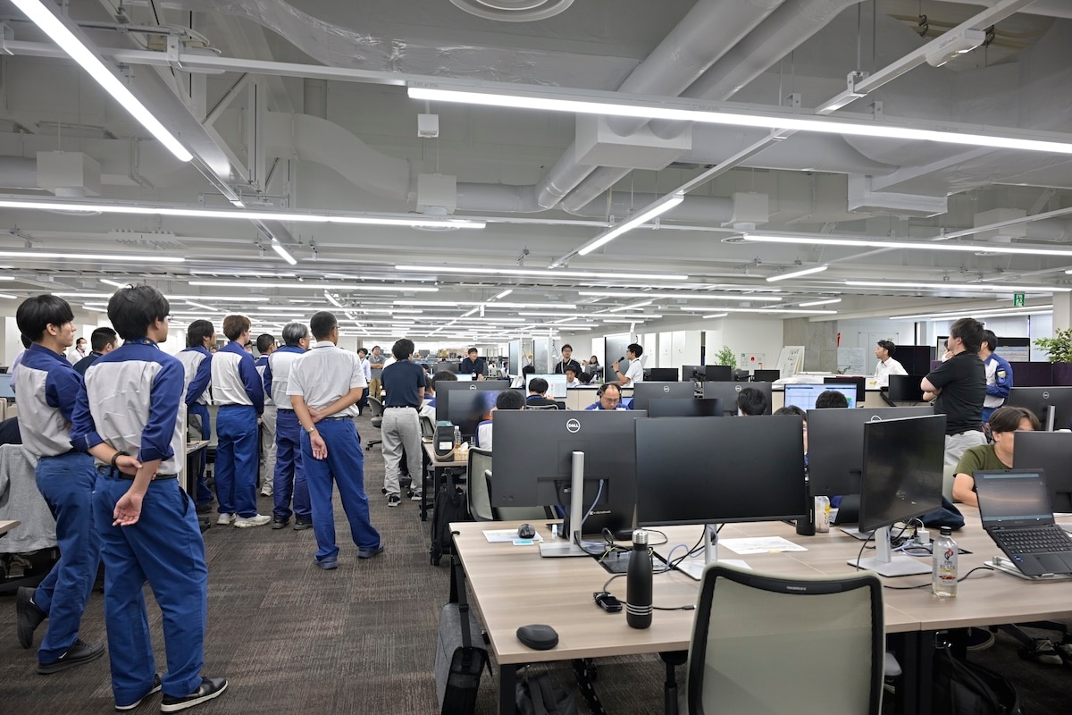 外のテラスだって執務スペース。気分転換に外気を吸いながらPCで作業。羨ましい。右は実車を使って研究や意見交換、検討会などのスペースでプレゼンスペースですかね。