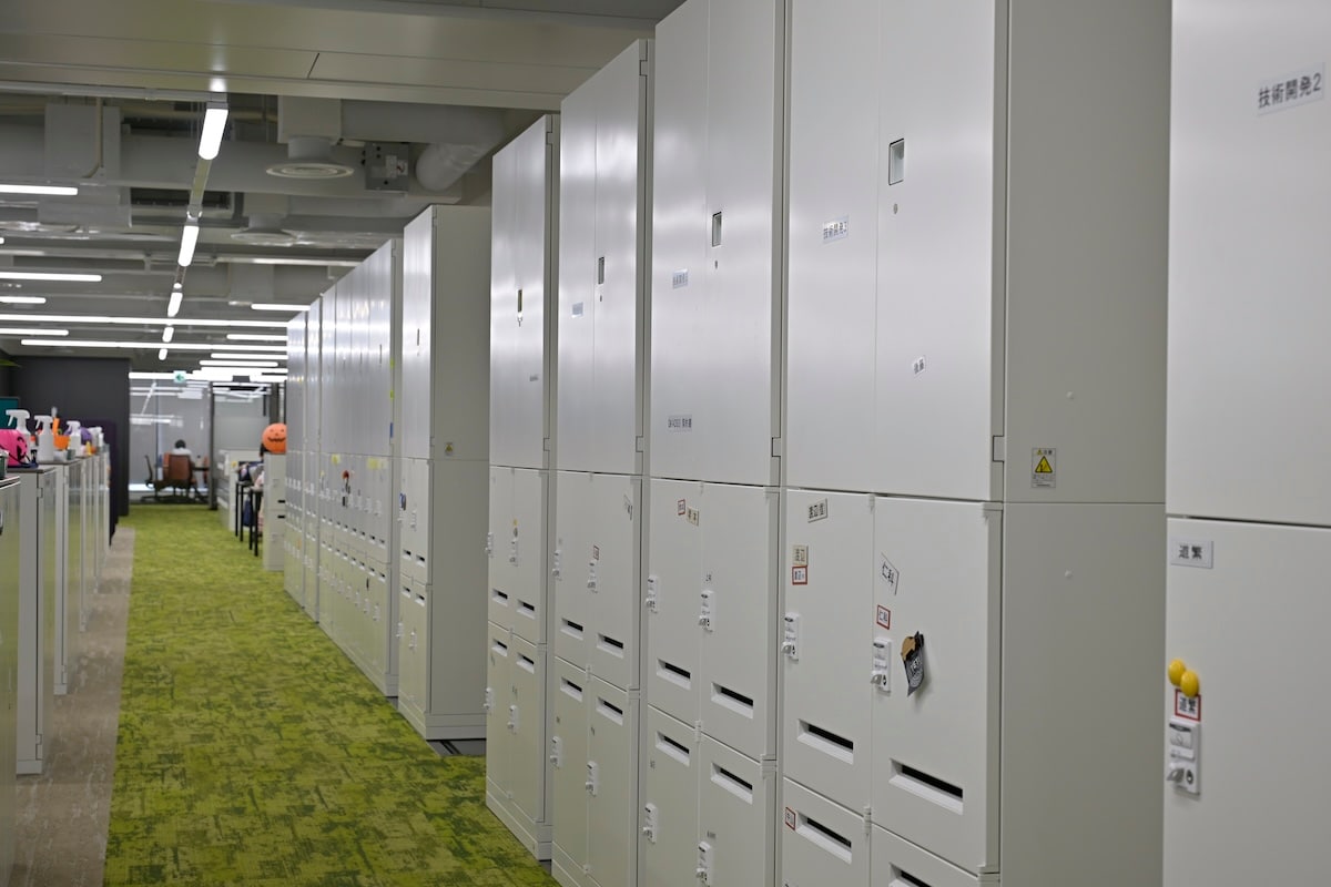 私物はロッカーに入れて、フリーアドレスで仕事。立って仕事もできます。おしゃれですね〜