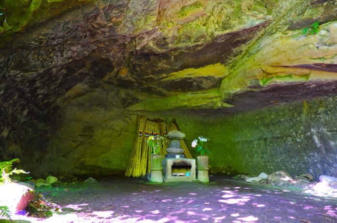 緑が美しい山道は、「北条高時腹切やぐら」へと続いています。倒幕軍に追いつめられた北条高時とその家臣らが自刃した場所。やぐらとは、平たく言うと鎌倉期のお墓・供養所のことです。