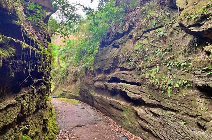 法性寺(逗子市)の裏手にある石切り場の遺構「お猿畑の大切岸(おさるばたけのおおきりぎし)」。切り立った崖が何百メートルも続く様は圧巻です。
